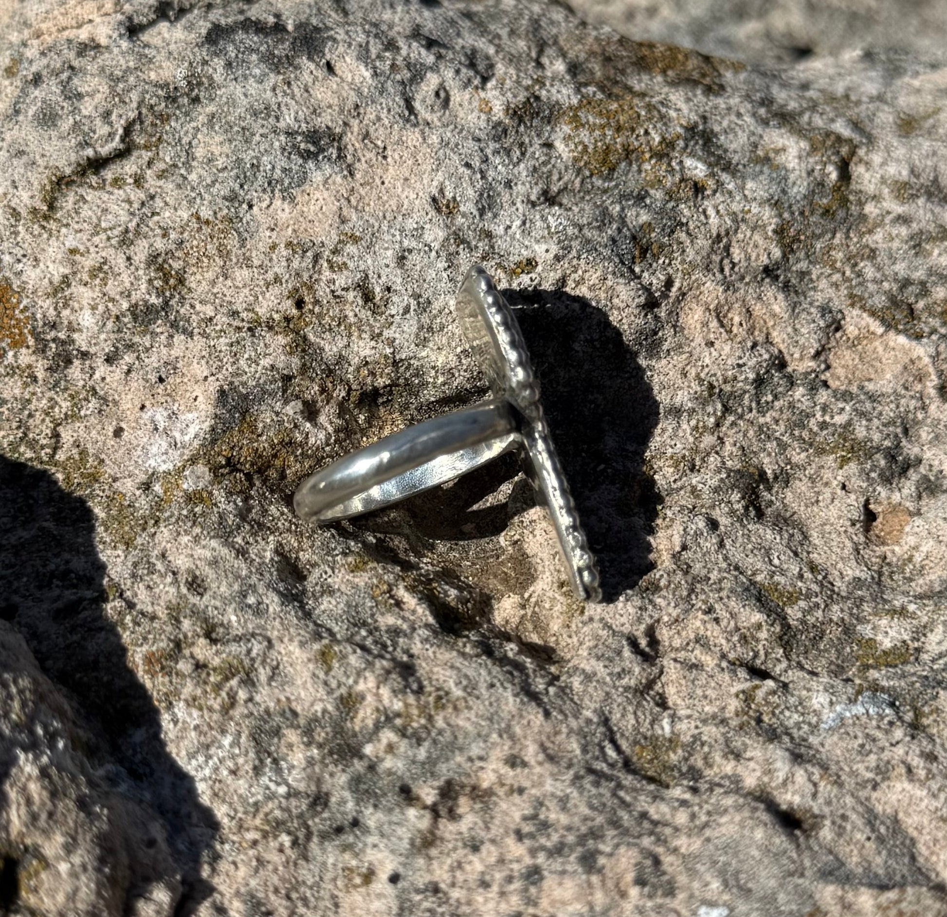 Handmade sterling silver ring featuring a beautiful iridescent Aurora Opal stone. This stone's color changes in different lighting.