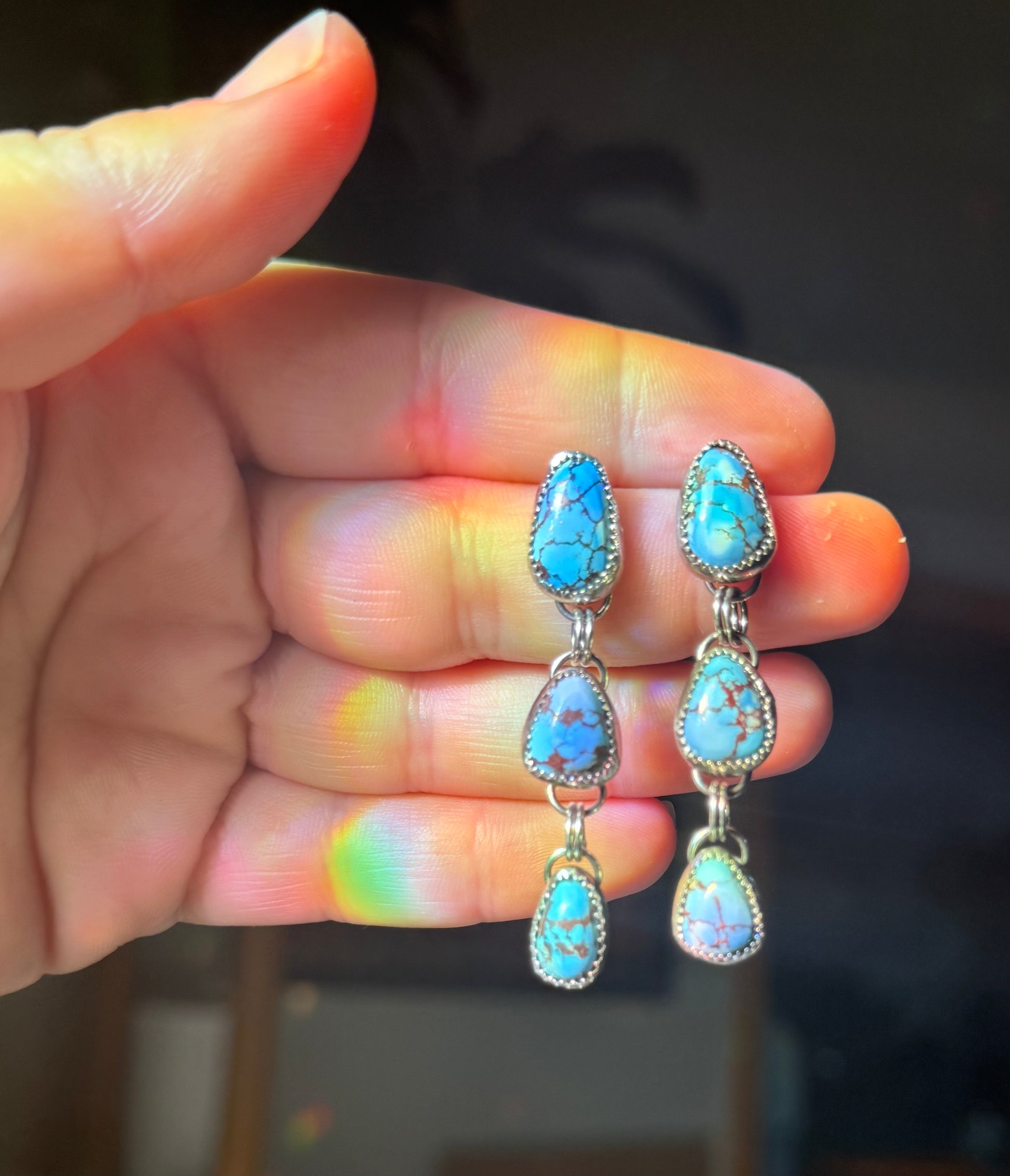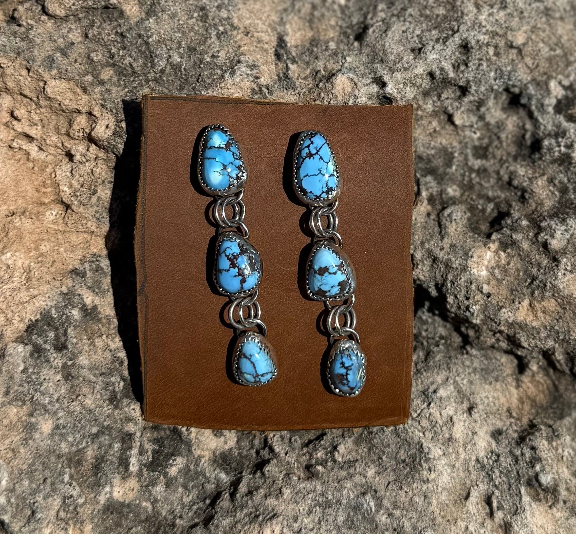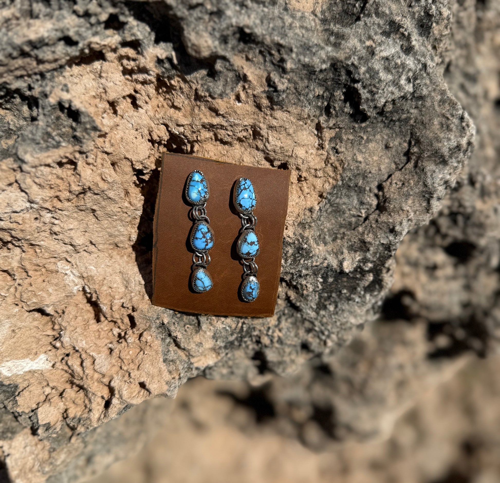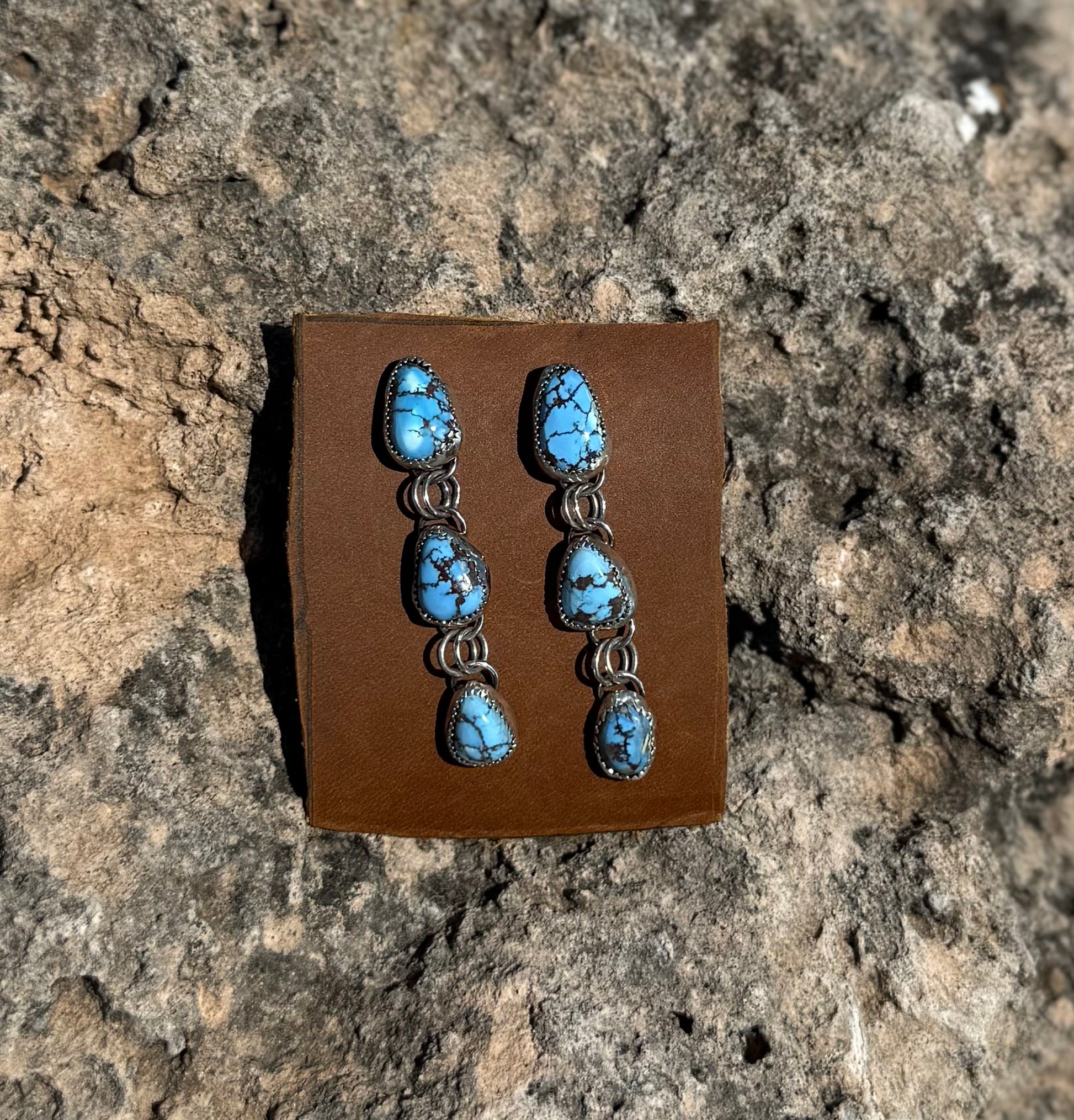 Handmade sterling silver earrings featuring golden hills turquoise stones. These earrings are light weight & designed to catch the light & move as you do.